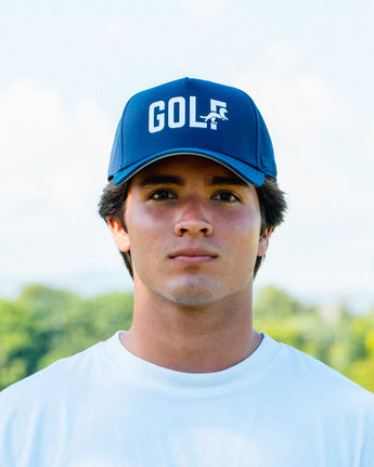 The Tourney GOLF cap features the word GOLF across the front — with the Ferret subtly embedded in the “F.” Built with water-repellent, dry-fit performance fabric and breathable mesh panels, it’s lightweight, structured, and made to keep you cool through every round.
